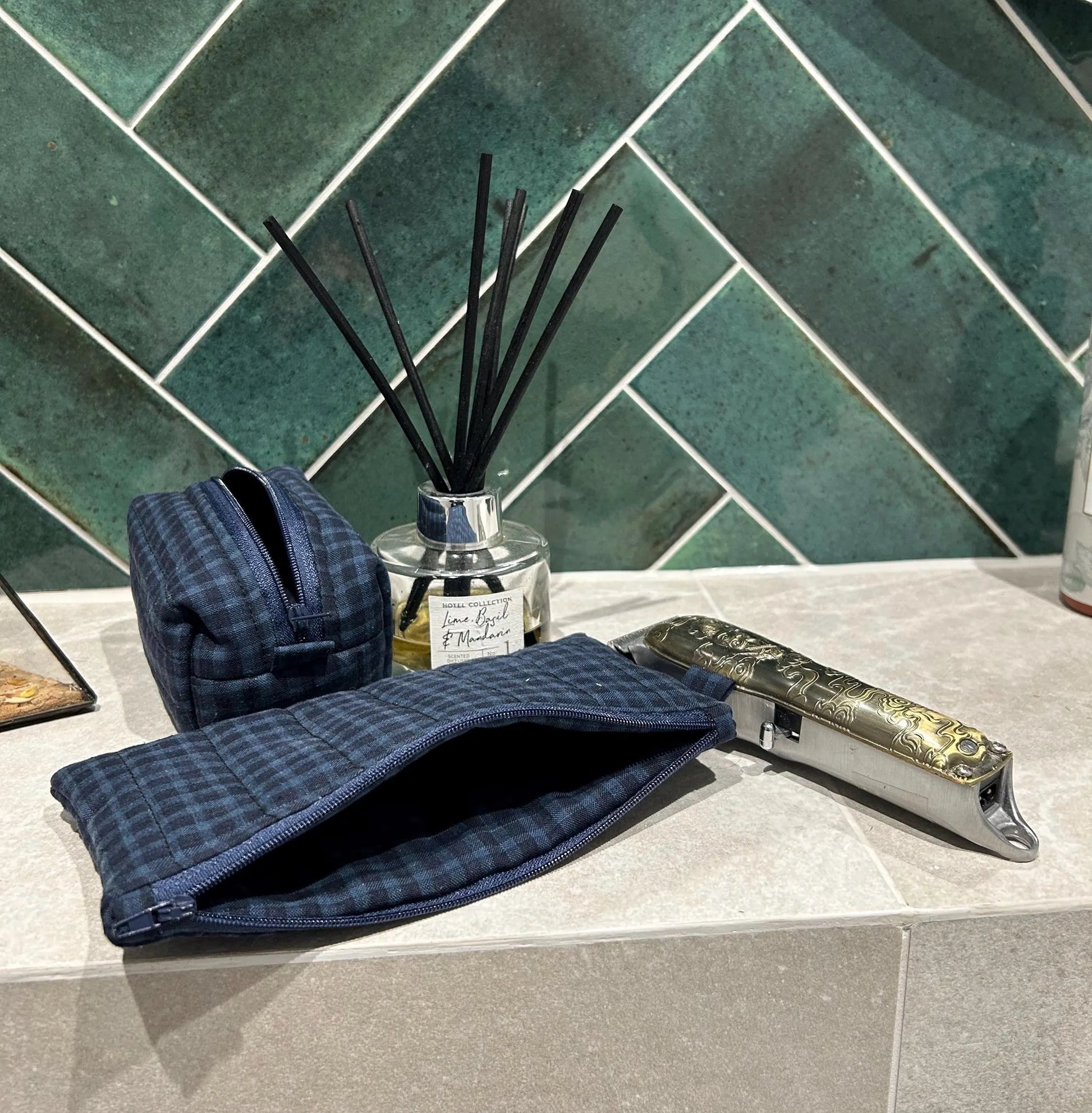 Organise your essentials in style with our toiletry pouches! Designed with a sophisticated blue tartan pattern, this pouch combines classic elegance with practical functionality. Ideal for travel or daily use, it offers a spacious interior to store toiletries, cosmetics, and other small items securely.